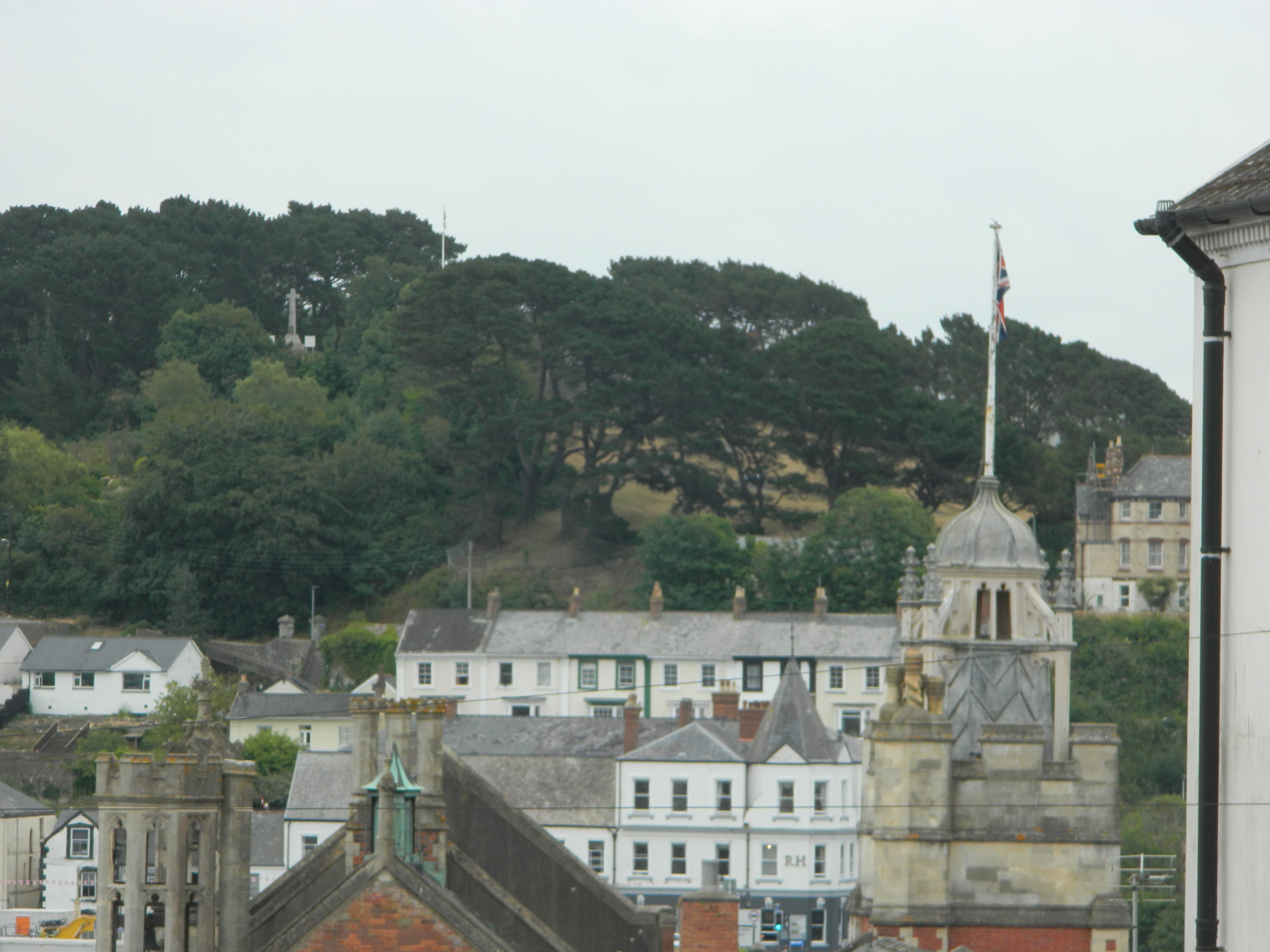 Looking down Bridge Street, over the Town Hall to the Monument at Chudleigh Fort